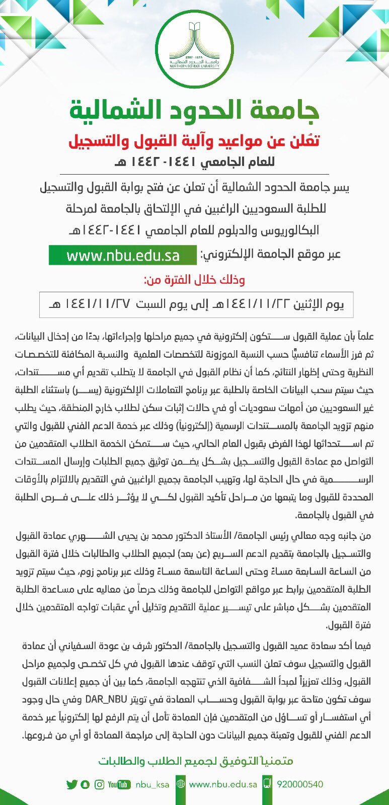 جامعة الحدود الشمالية نسب القبول - اÙÙØ¨ÙÙ Ù Ø§ÙØªØ³Ø¬ÙÙ - جامعة الحدود الشمالية di twitter معالي مدير الجامعة الأستاذ الدكتور محمد الشهري يعلن نتائج الترشيح الأول للطلبة.